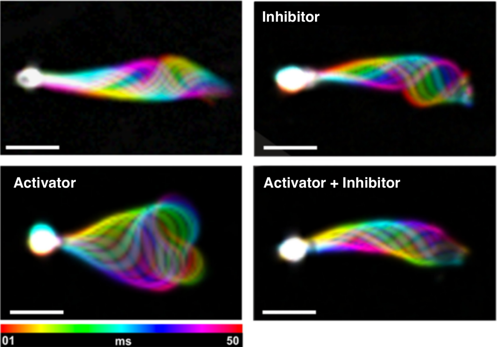 For fun, here are images reflecting the movement of individual human sperm cells when activated (with signals), inhibited, neither, or both.1 Notice the widespread movement following activation and the loss of that movement with the addition of the inhibitor. Enjoy the pretty colors!