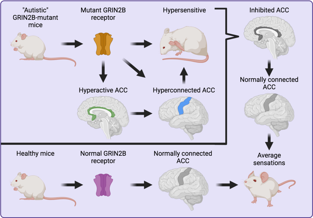 Knowing autistic individuals are more sensitive than average, researchers recorded mutated-GRIN2B mice responses to physical sensation tests. On each test (mechanical, electrical, and heat), the mutated-GRIN2B mice’s results showed they were more sensitive to the stimuli.2 Notably, upon testing the mutated-GRIN2B mice, their brain signals increased due to the activities and stress; however, amongst all brain regions, there was a significant increase in the Anterior Cingulate Cortex (ACC).2 The ACC is a massively important hub in the brain, known for chronic pain and error detection,9 among other things. To test if this increased excitability in the ACC influenced the sensitive behaviors in the mutated-GRIN2B mice, the researchers blocked most glutamate neuron activity in the ACC. As a result, the hypersensitive behaviors in the GRIN2B-mutant mice vanished.2